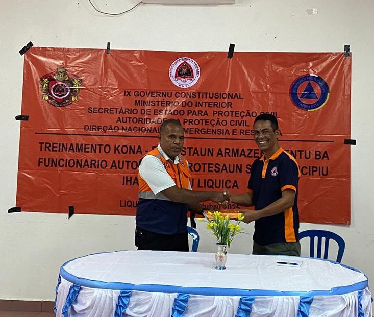 Liquiça, 03 Outobru 2025, Komandante Operasional Autoridade Protesaun Sivíl (APC) Munisípiu Liquiça, Tobias da Silva dos Santos, hamutuk ho funsionáriu APC, enserra ho susesu formasaun kona-bá Jestaun Armazenamentu, ne’ebé realiza durante loron tolu iha Munisípiu Liquicá.